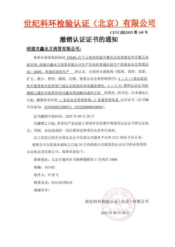 撤销认证证书的通知