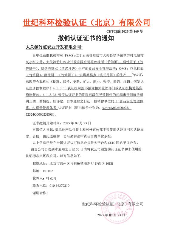 撤销认证证书的通知