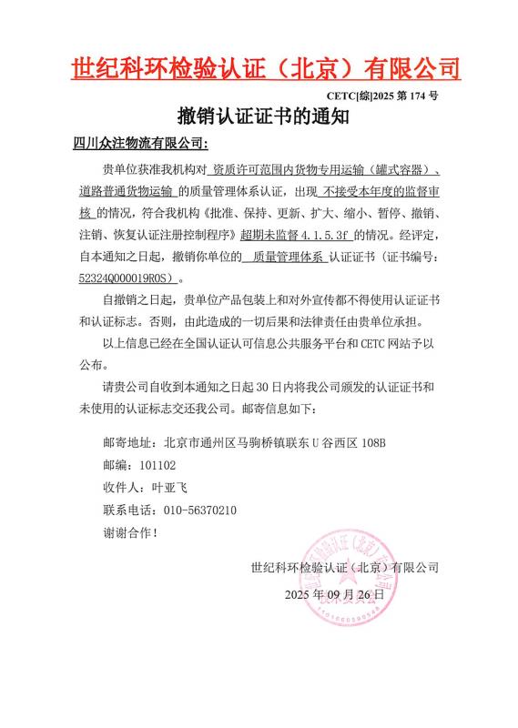 撤销认证证书的通知
