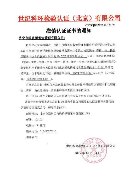 撤销认证证书的通知