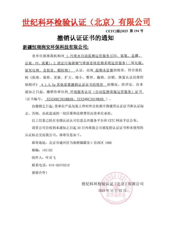 撤销认证证书的通知