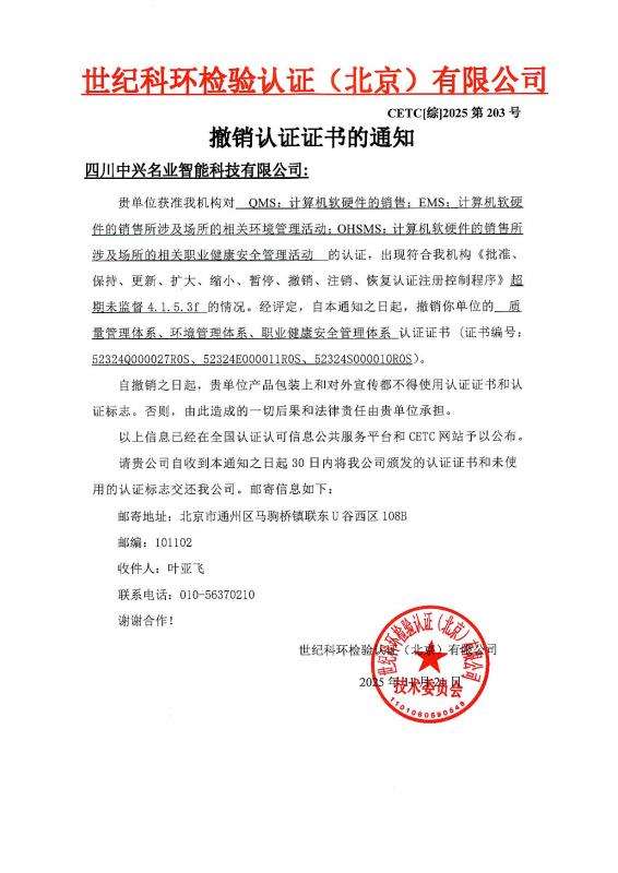 撤销认证证书的通知