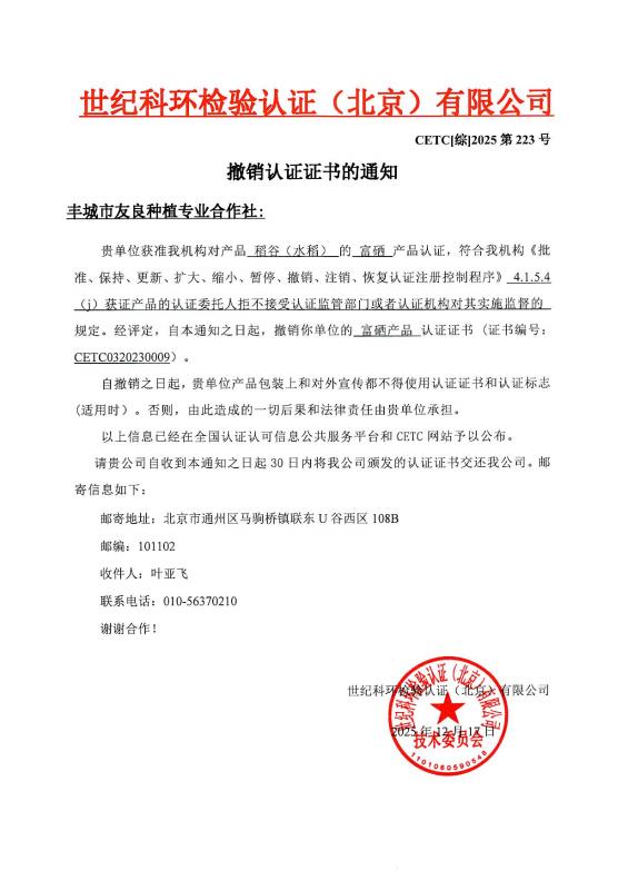 撤销认证证书的通知