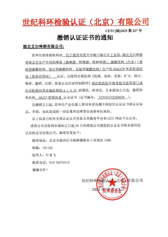 撤销认证证书的通知