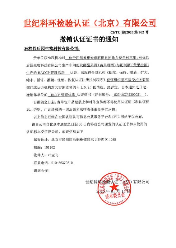 撤销认证证书的通知