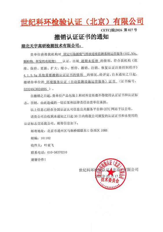 撤销认证证书的通知