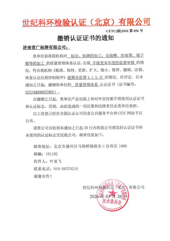 撤销认证证书的通知